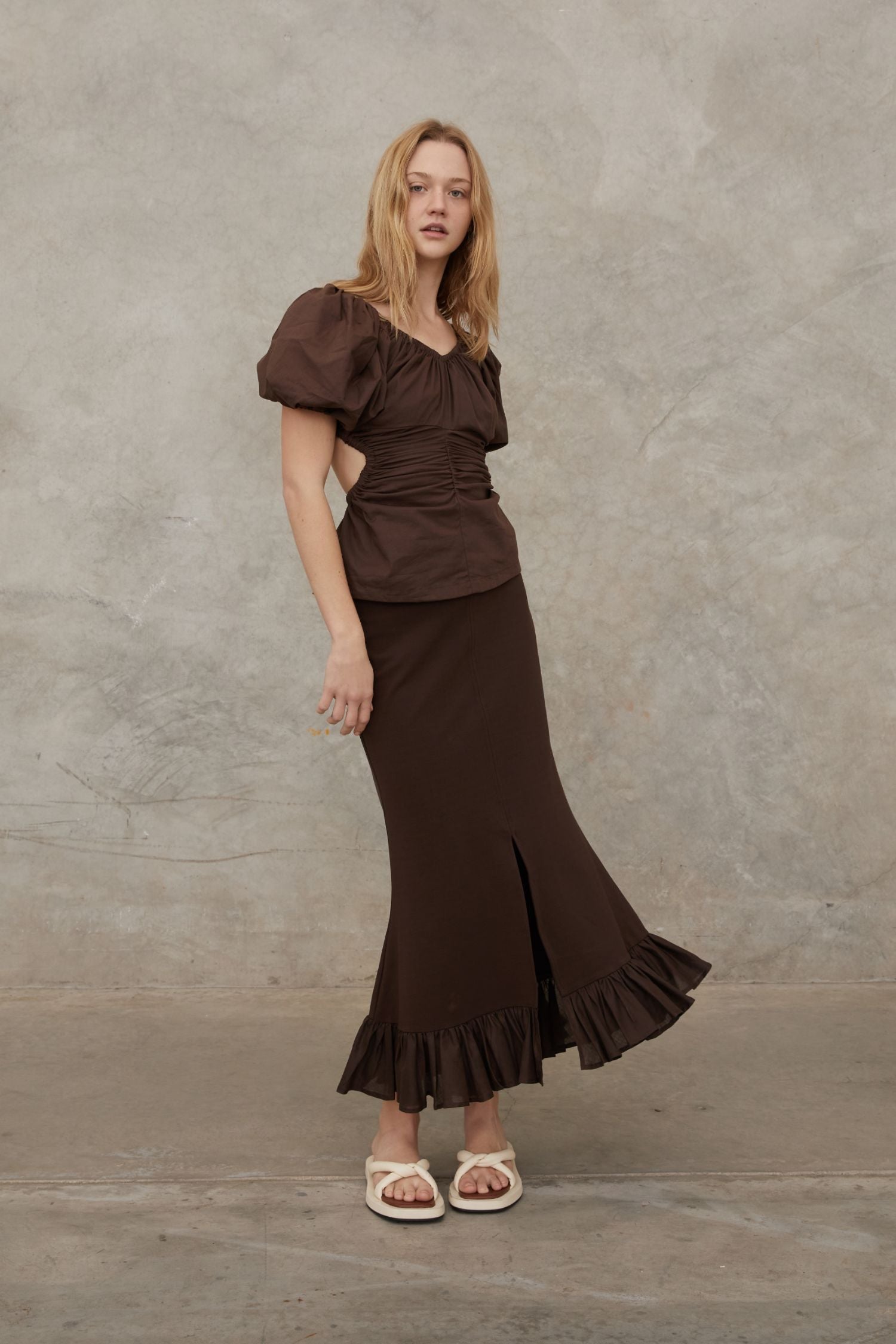 Soft and romantic, this organic cotton top features puff sleeves with flattering elasticated circle cutouts at the waist and a slight flare at the bottom. Considered details for an effortless and refined look.